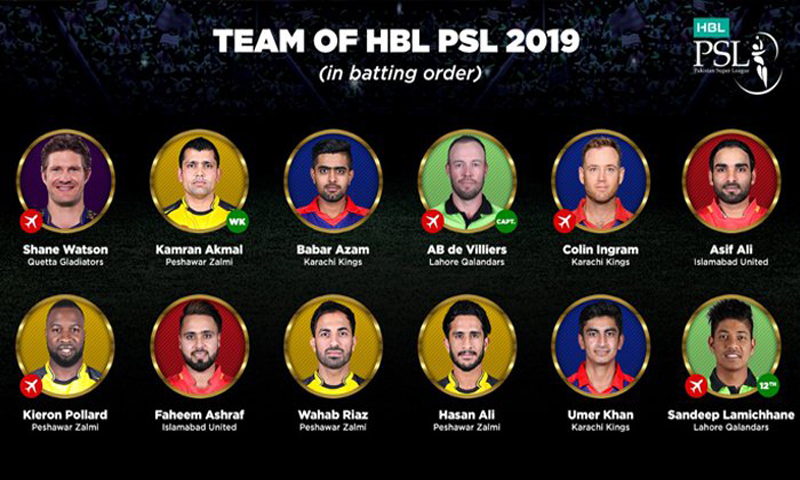 پی سی بی کےماہرین کی طرف سے تشکیل دیے گئے 12 رکنی اسکواڈ میں کپتان اے بی ڈویلیئرز، شین واٹسن، وکٹ کیپر کامران اکمل، بابر اعظم،کولن انگرام، آصف علی،کیرون پولارڈ، فہیم اشرف، وہاب ریاض، حسن علی اور عمر خان شامل ہیں۔سندیپ لمی چانے کو بارہویں کھلاڑی کی حیثیت سے منتخب کیا گیاہے۔ دلچسپ بات یہ ہے کہ پی ایس ایل کے بہترین کھلاڑیوں کی فہرست میں کوئٹہ گلیڈئیٹر اور پاکستان ون ڈے اور ٹی ٹوئنٹی کے کپتان سرفراز احمد جگہ بنانے میں کامیاب نہیں ہو سکے۔
