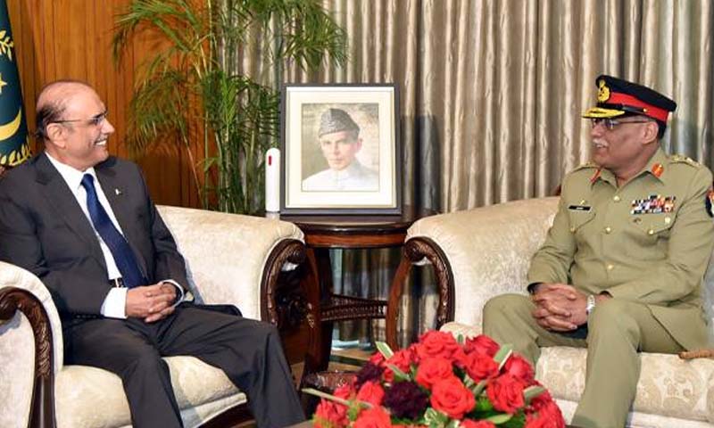 صدر آصف علی زرداری سے چیئرمین جوائنٹ چیفس آف اسٹاف کمیٹی جنرل ساحر شمشاد مرزا کی ایوان صدر میں ملاقات ہوئی جس میں قومی تعاون سے دہشتگردی کی لعنت کو جڑ سے اکھاڑ پھینکنے کے عزم کا اظہار کیا گیا۔