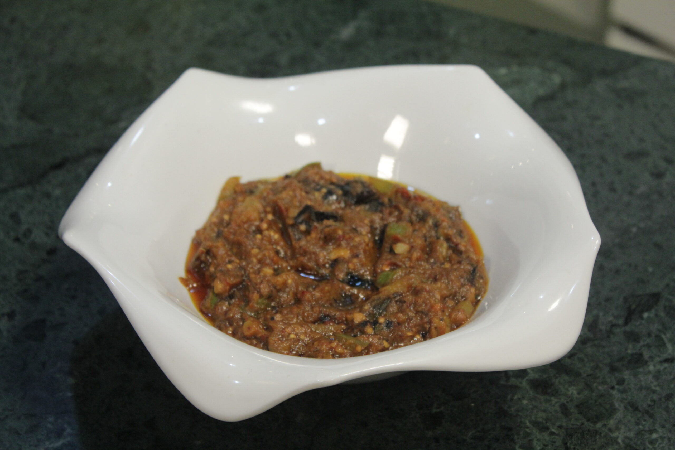 فرائننگ پین میں 3کھانے کے چمچے تیل گرم کریں‘ اس میں بینگن بھو ن کر ایک دیگچی میں نکال لیں۔فرائننگ پین میں باقی تیل ڈالیں اور شملہ مرچ اور لہسن بھو ن کر دیگچی میں ڈالیں۔ اس میں باقی اجزاء ڈالیں اور جوش آنے تک پکائیں‘ پانی خشک ہوجائے تو اچھی طرح سے چلاکر دَم پر رکھ دیں۔