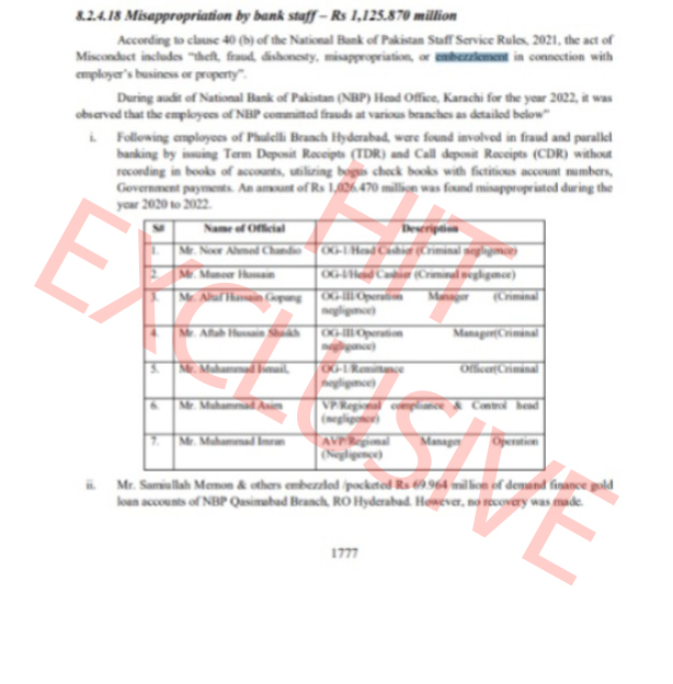 خصوصی آڈٹ رپورٹ میں انکشاف ہوا ہے کہ غبن اور فراڈ نیشنل بینک حیدرآباد شہر کی پھولیلی برانچ کے سات افسران نے کیا، ملزمان نے بوگس چیک بکس اور جعلی بینک اکائونٹس بنا کرایک ارب سے زائد کا فراڈ کیا۔