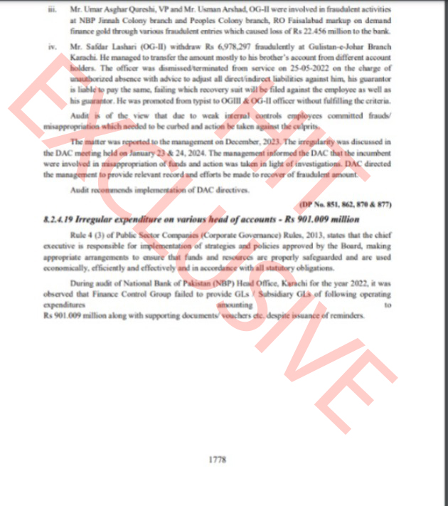 فراڈ میں ایک وائس پریذیڈنٹ، ریجنل منیجر اور تین گریڈ ون اور دو گریڈ ٹو کے افسران ملوث پائے گئے ہیں،فیصل آباد، کراچی اور حیدرآباد کی برانچوں کے چار افسران نے کروڑوں روپے کا فراڈ کیا،ذمہ دار افسران کیخلاف ایکشن لینے کی سفارش کی گئی ہے۔