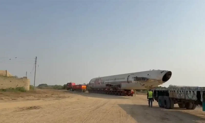 طیارے کو براستہ سڑک نیشنل ہائی وے حیدر آباد منتقل کیا جا رہا ہے، طیارے کوتین حصوں میں تقسیم کرکے ملٹی ایکسل ٹریلر پر منتقل کیا گیا۔