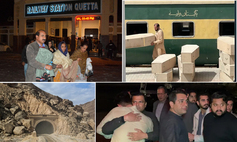 دہشتگردوں نے بولان پاس کے علاقے میں جعفر ایکسپریس پر حملہ کر کے معصوم شہریوں کو ٹارگٹ کیا،دہشتگردوں نے جعفر ایکسپریس کو ٹنل میں روک کر مسافروں کو یرغمال بنایاہواہے،مسافروں میں اکثریت عورتوں اور بچوں کی بھی ہے۔