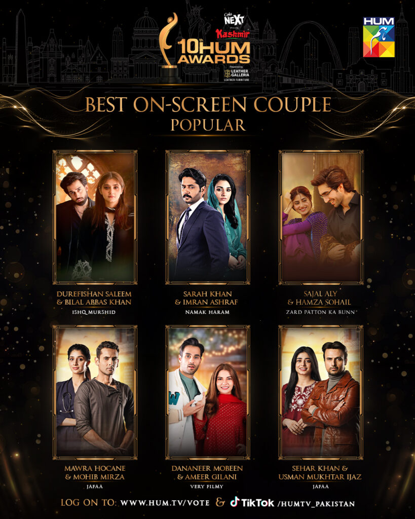 بہترین آن اسکرین جوڑی کی دوڑ میں بھی ناظرین کے پسندیدہ چہروں کا مقابلہ ہو گا۔ عشق مرشد کے شبرہ اور فضل بخش، زرد پتوں کا بن کے مینوں اور ڈاکٹر نوفل سمیت درفشاں سلیم، بلال عباس، سجل علی اور حمزہ سہیل جیسی مقبول جوڑیاں اس ایوارڈ کی امیدوار ہیں۔