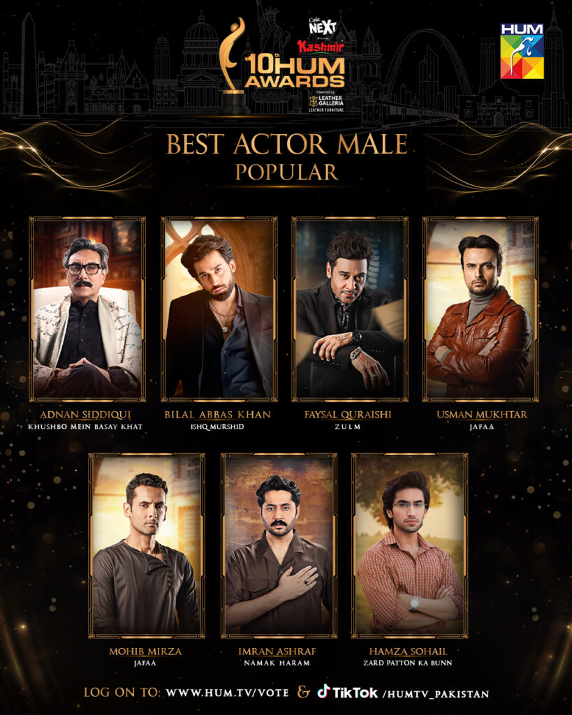 مرد اداکاروں کی کیٹیگری میں فیصل قریشی اور عدنان صدیقی جیسے سینئر فنکاروں کے ساتھ ساتھ نئی نسل کے اداکار حمزہ سہیل، بلال عباس، عمران اشرف، موحب مرزا اور عثمان مختار بھی بہترین اداکار کے ایوارڈ کے لیے نامزد ہیں۔ ہر ایک نے اپنے منفرد اندازِ اداکاری سے ڈراموں کو نیا رنگ دیا۔