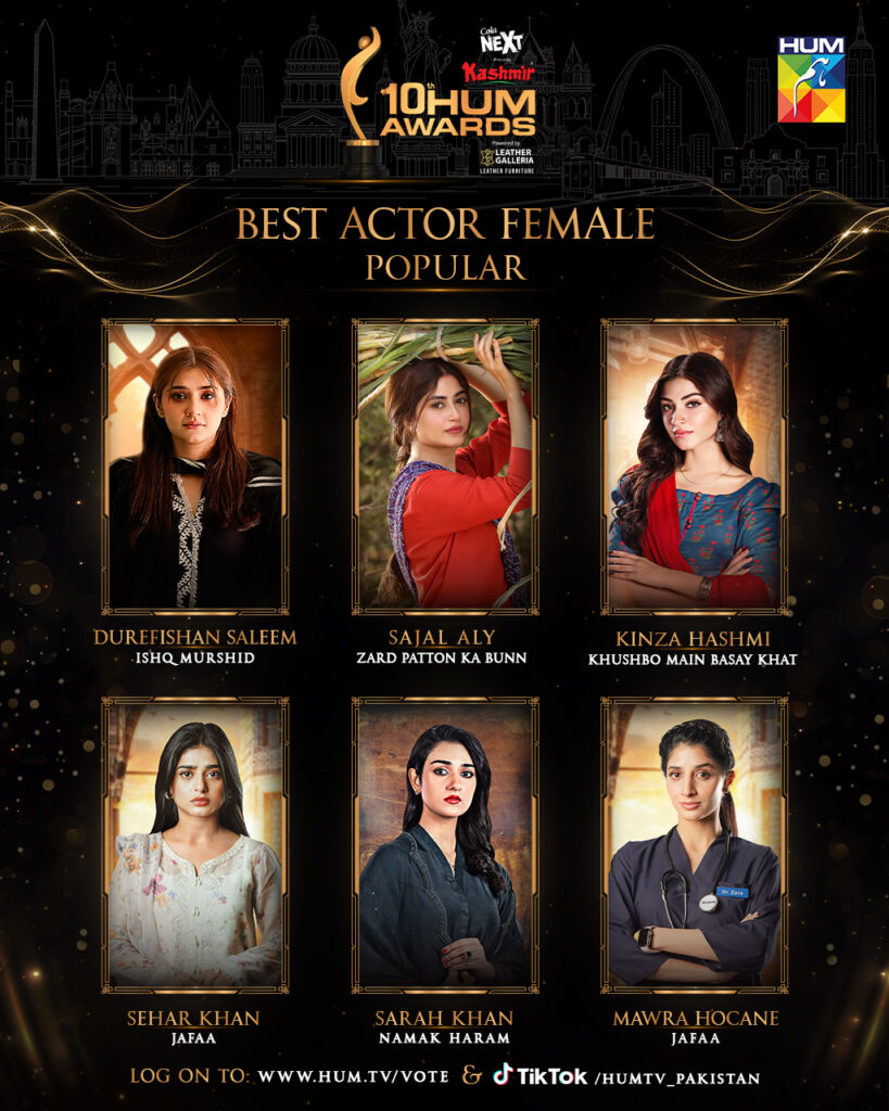 دوسری طرف یادگار کرداروں کی بدولت سجل علی، ماورا حسین اور درفشاں سلیم بہترین اداکارہ کے ایوارڈ کی مضبوط امیدوار قرار دی جا رہی ہیں۔ ان کے ساتھ ساتھ سحر خان، سارہ خان اور کنزہ ہاشمی بھی بیسٹ ایکٹریس کی فہرست میں شامل ہیں، جنہوں نے اپنے ڈراموں میں بہترین پرفارمنس سے شائقین کو متاثر کیا۔