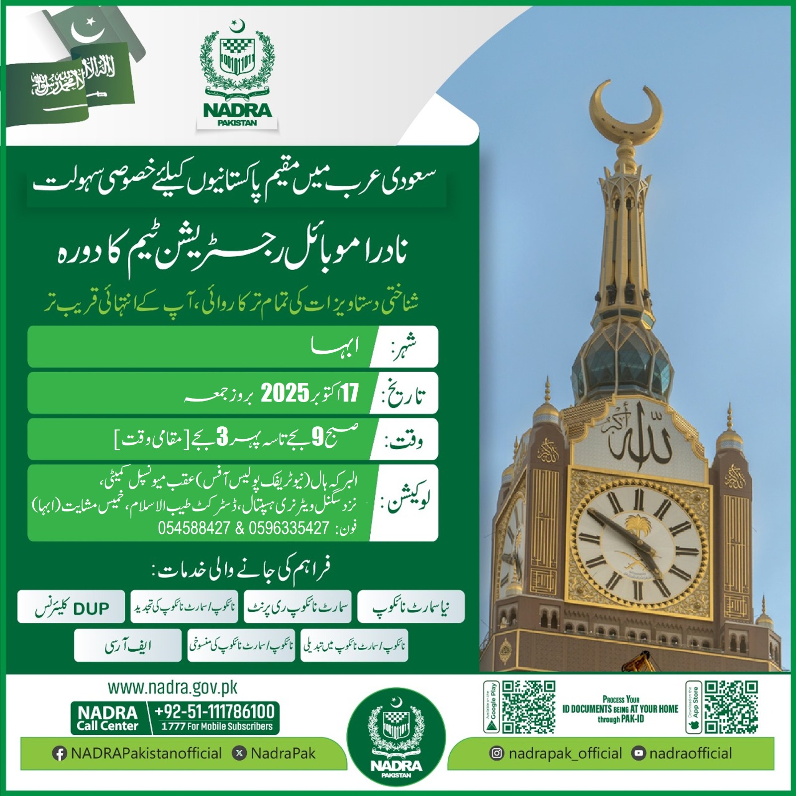 نادرا (nadra)نے سعودی عرب میں مقیم پاکستانیوں کیلئے خصوصی سہولت فراہم کردی ۔