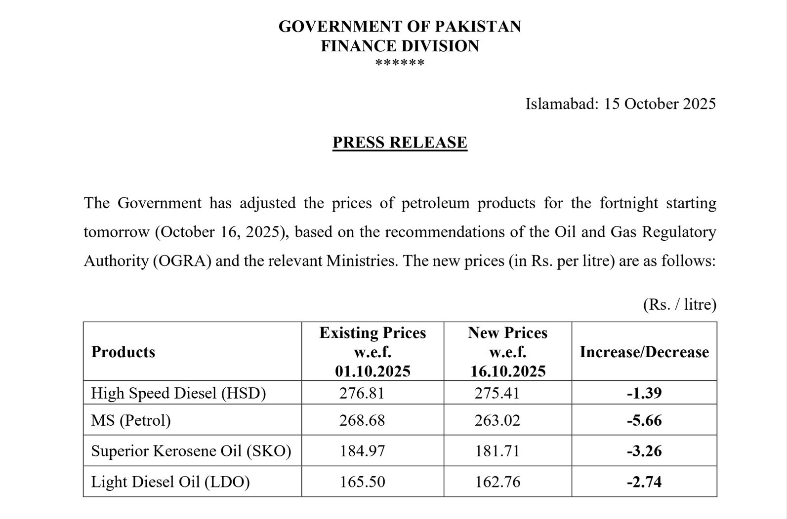 حکومت نے پٹرولیم مصنوعات کی قیمتوں میں کمی کر دی جس کا نوٹیفکیشن بھی جاری کردیا گیا ہے۔