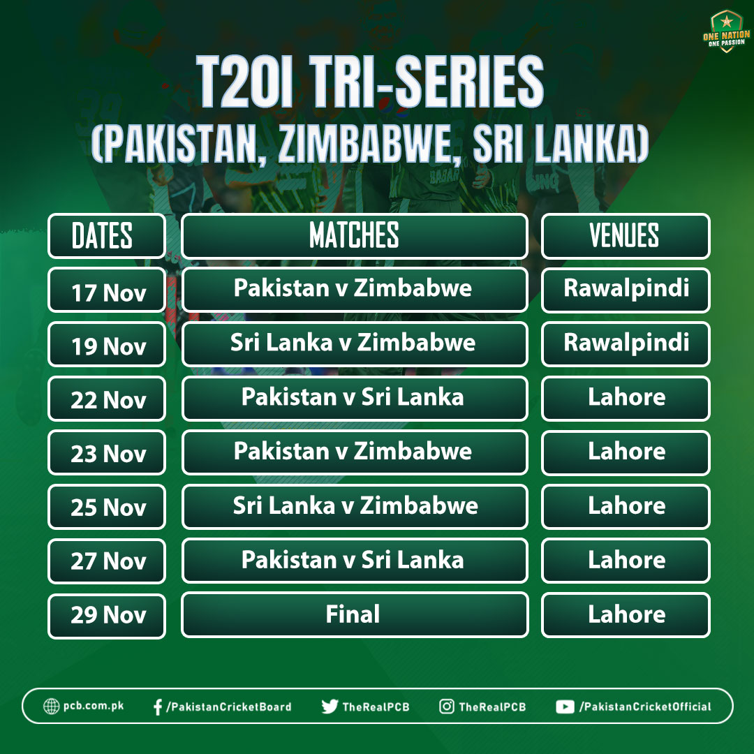 پی سی بی کے مطابق 3ملکی سیریز 17 سے 29 نومبر تک راولپنڈی اور لاہور میں کھیلی جائے گی ،پاکستان اور زمبابوے کا افتتاحی میچ 17 نومبر کو راولپنڈی میں ہوگا۔