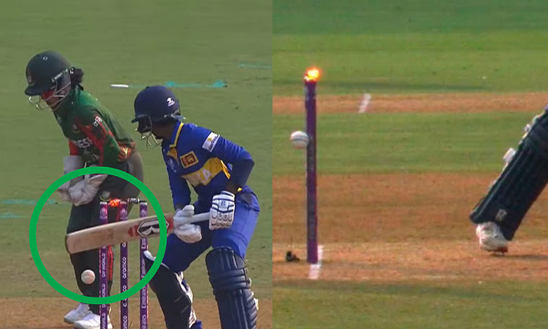 بال پوری طرح سری لنکن بیٹر کے بلے پر نہ آئی اور گیند بیٹ کے اندرونی حصے سے ٹکرا کر آف اسٹمپ کے قریب اچھلی اور وکٹ کیپر نگار سلطانہ کی دائیں ٹانگ سے لگ کر واپس اسٹمپ پر جا لگی۔