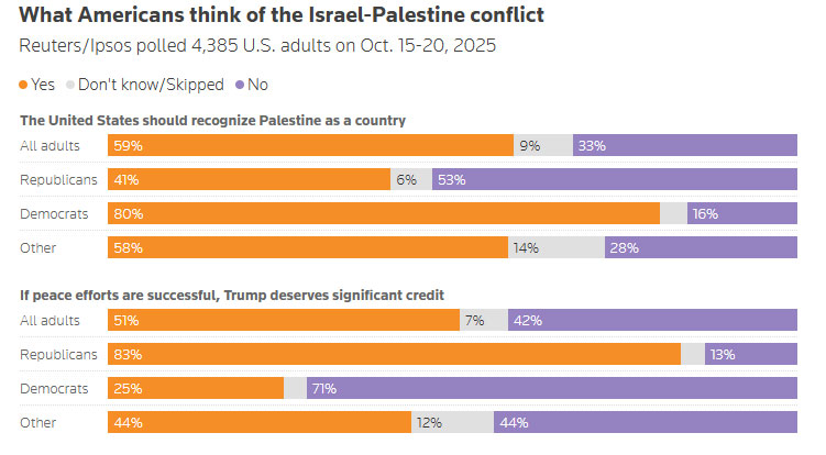 دوسری جانب، جنگ بندی کے معاہدے نے غزہ میں امن کی امید پیدا کی ہے۔ سروے کے مطابق 51 فیصد امریکیوں نے کہا کہ اگر امن قائم رہا تو ٹرمپ یہ “اہم کریڈٹ” لینے کے حقدار ہوں گے۔