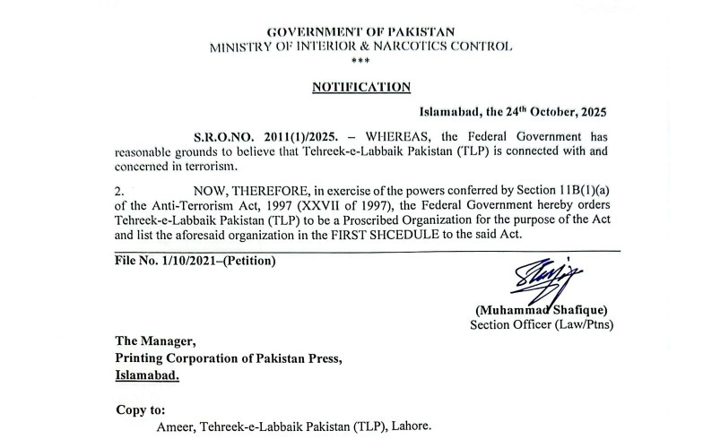 نوٹیفکیشن میں مزید کہا گیا ہے کہ انسدادِ دہشت گردی ایکٹ 1997 کے تحت ٹی ایل پی کو فرسٹ شیڈول میں شامل کرتے ہوئے کالعدم جماعتوں کی فہرست میں باقاعدہ شامل کر لیا گیا ہے۔