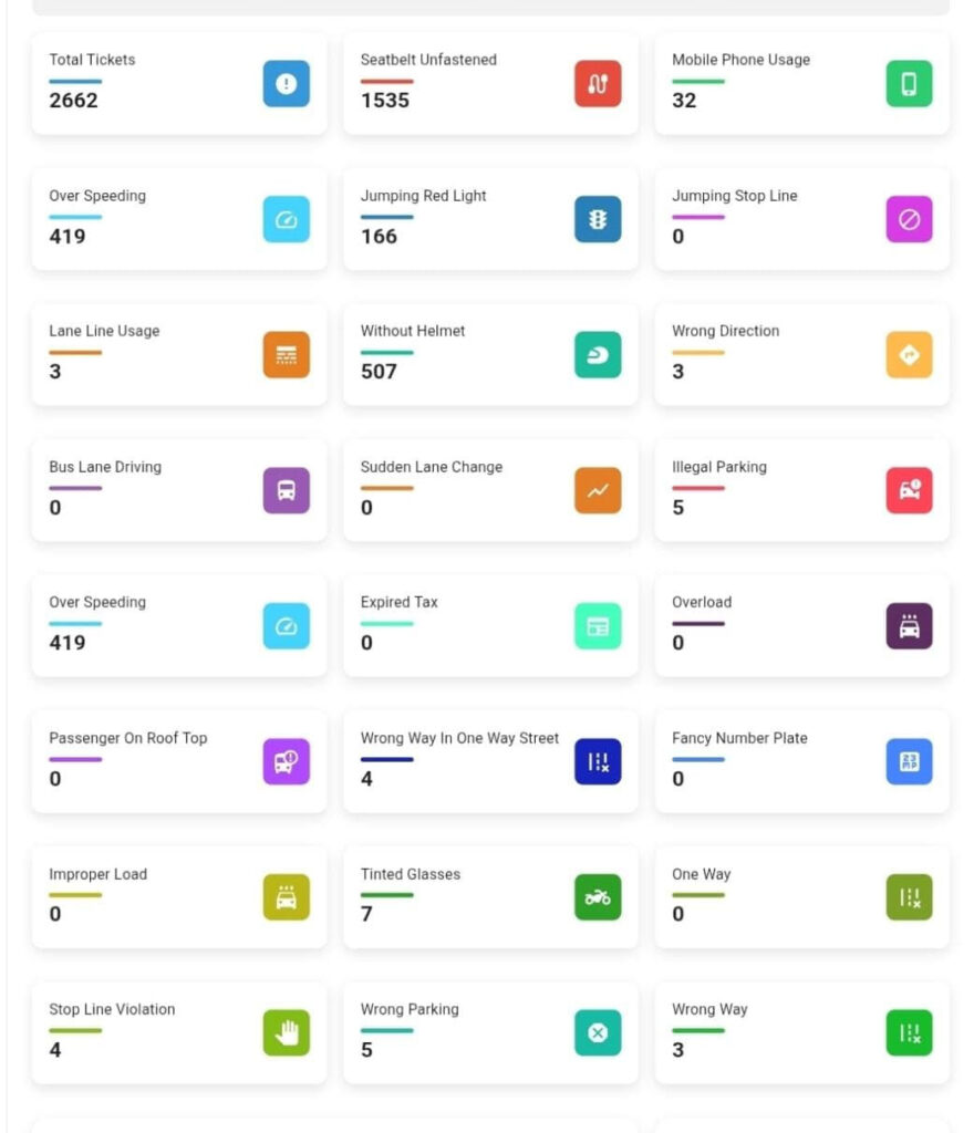 اسی طرح اوور اسپیڈنگ پر 419، ریڈ سگنل توڑنے پر 166، موبائل فون کے استعمال پر 32، اور ٹِنٹڈ گلاسز والی گاڑیوں پر 7 ای چالان جاری کیے گئے۔