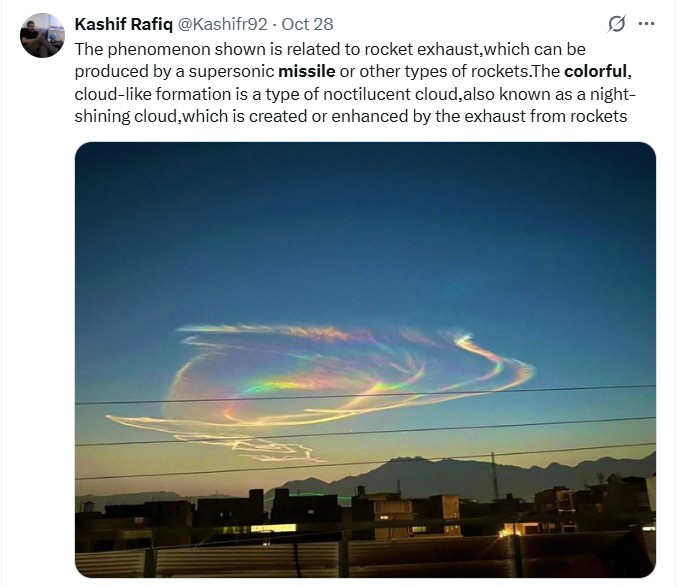 تاہم بعد ازاں محکمہ موسمیات پاکستان (PMD) نے وضاحت جاری کرتے ہوئے بتایا کہ یہ منظر کسی میزائل تجربے کا نہیں بلکہ ایک نایاب قدرتی مظہر لینٹی کیولر کلاؤڈ فارمیشن (Lenticular Cloud Formation) کا نتیجہ تھا۔
