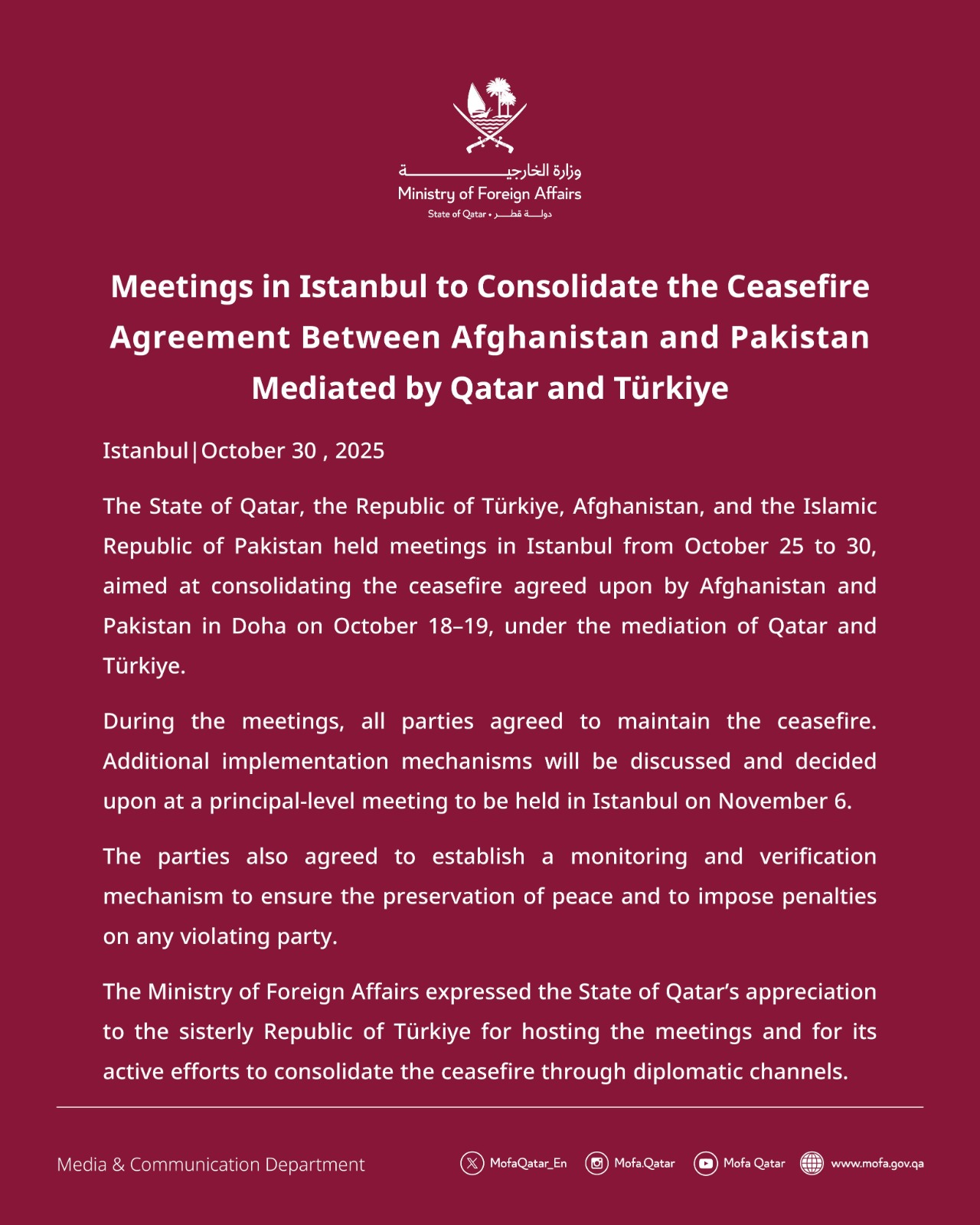 3. مزید تفصیلات طے کرنے اور ان پر عملدرآمد کے لیے اگلی ملاقات 6 نومبر کو استنبول میں ہوگی۔