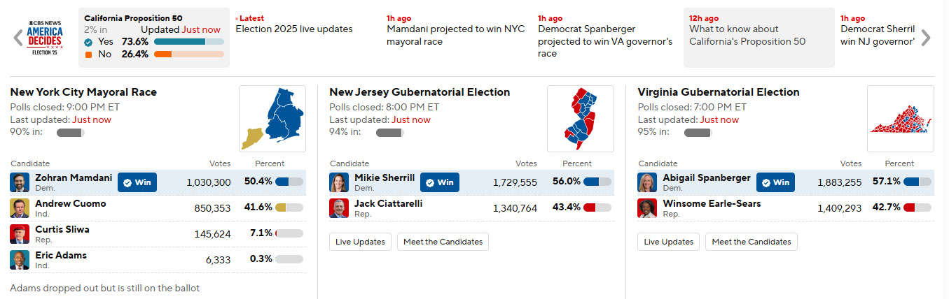 ان انتخابات میں ڈیموکریٹک پارٹی نے شاندار کامیابی حاصل کرتے ہوئے نیویارک، ورجینیا اور نیو جرسی میں ہونے والے گورنر اور میئر کے انتخابات میں تینوں نشستیں جیت لیں، جسے پارٹی کے لیے بڑا بریک تھرو قرار دیا جا رہا ہے۔