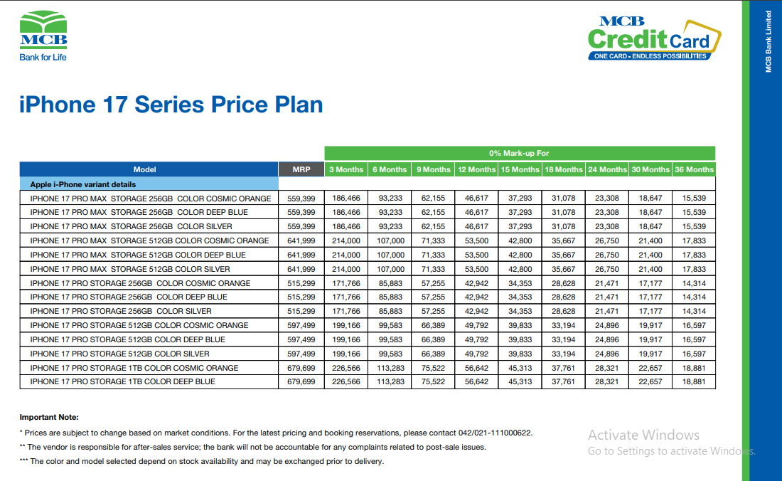 کوئی بھی صارف جو iPhone 17 سیریز کو اقساط پر خریدنا چاہتا ہے، وہ ایم سی بی کے ہیلپ لائن نمبر