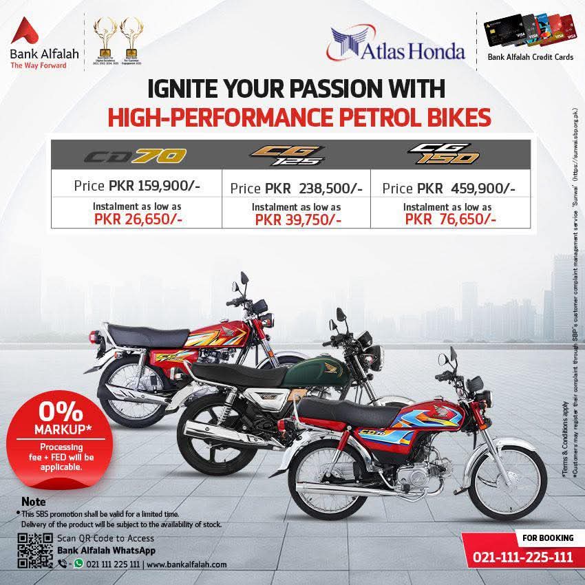 بینک الفلاح نے اپنے صارفین کے لیے ایک انتہائی پرکشش اور سہل فنانسنگ پلان متعارف کرایا ہے جس کے تحت ہونڈا موٹر سائیکلز(honda bikes) کی خریداری اب آسان اقساط پر ممکن ہوگئی ہے، وہ بھی مکمل زیرو فیصد مارک اپ کے ساتھ۔ نئی پیشکش محدود مدت کے لیے متعارف کرائی گئی ہے اور اس کا مقصد عام صارفین کے لیے مقبول ہونڈا بائیکس کو مزید قابلِ رسائی بنانا ہے۔