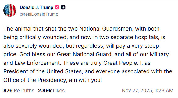 امریکی صدر نے واقعے سے متعلق اپنے بیان میں فائرنگ کرنے والے شخص کو جانور قرار دیتے ہوئے خبردار کیا کہ نیشنل گارڈ کے اہلکاروں پر فائرنگ کرنے والے کو بھاری قیمت چکانی ہوگی۔