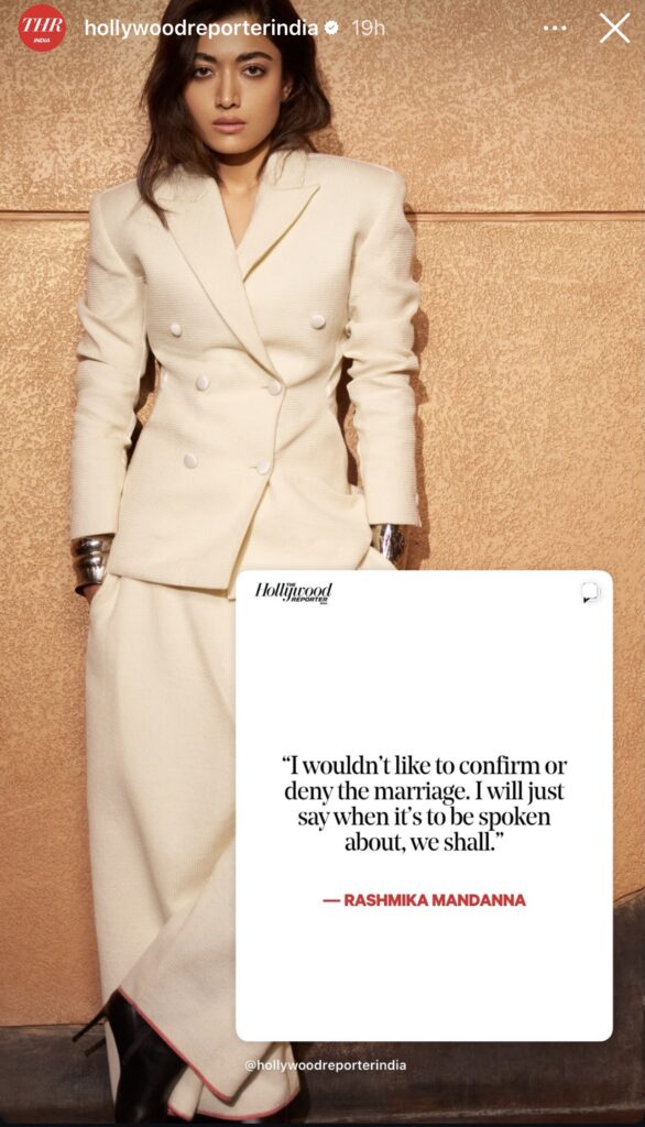 پشپا اسٹار رشمیکا مندنا نے انٹرویو میں کہا کہ میں نہ تو اس کی تصدیق کرنا چاہتی ہوں اور نہ ہی انکار۔ انہوں نے وضاحت کی کہ وہ اس بارے میں بات تب کریں گی جب انہیں مناسب لگے، اس وقت ان کا بنیادی فوکس اپنے کیریئر پر ہے۔