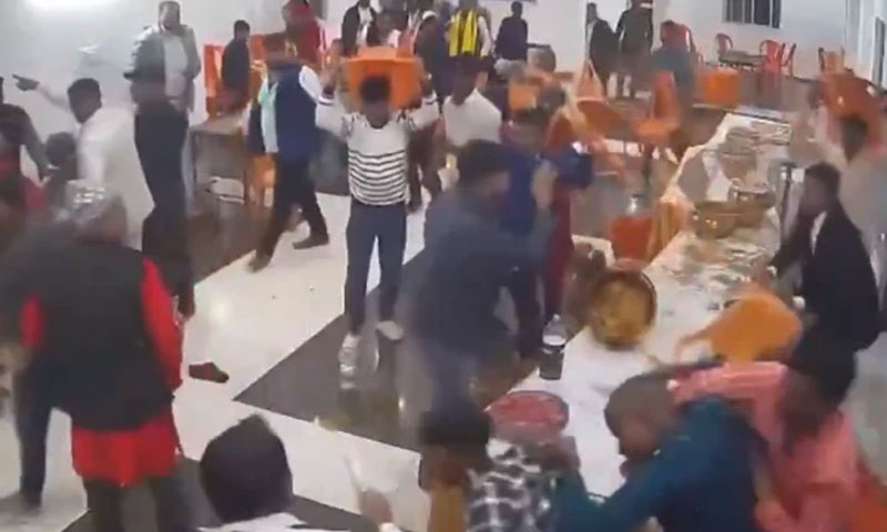 ویڈیو میں واضح طور پر دیکھا جا سکتا ہے کہ دلہا اور دلہن کے اہلِ خانہ ایک دوسرے پر کرسیاں اور برتن پھینک رہے ہیں، جبکہ کچھ افراد گھونسے اور دھکے مارتے بھی نظر آ رہے ہیں۔