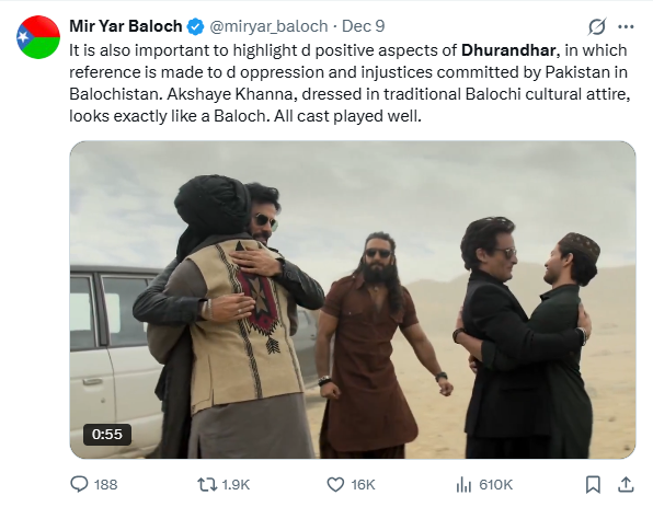 ادھر بعض افراد نے اس مثبت پہلو پر روشنی ڈالی کہ فلم نے بلوچ ثقافت کو اس انداز سے متعارف کروایا جو عام ڈراموں اور فلموں میں نظر نہیں آتا۔ انہوں نے کہا کہ اگرچہ فلم کا سیاسی پس منظر قابل بحث ہے، مگر بلوچ ناچ-رقص اور ثقافتی نمائندگی کے مناظر نایاب اور مضبوط تھے۔