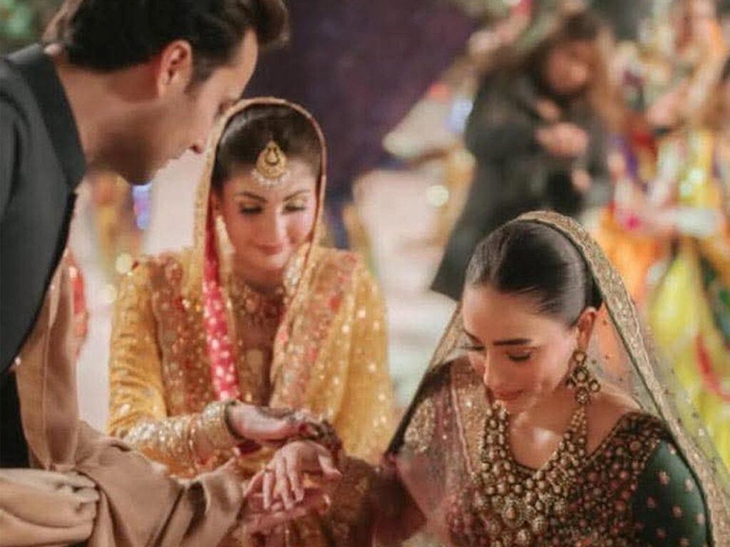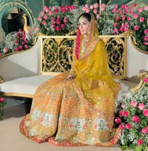 تقریب کے دوران لی گئی اس تصویر میں مریم نواز کو نہایت روایتی لباس میں دیکھا جا سکتا ہے۔ انہوں نے سنہری اور زرد رنگ کے امتزاج پر مشتمل بھاری اور نفیس لباس پہنا ہوا ہے، جو مشرقی ثقافت اور شادی کی روایات کی عکاسی کرتا ہے۔