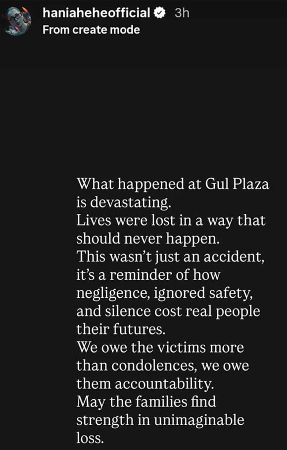اداکارہ ہانیہ عامر نے اپنی انسٹاگرام سٹوری میں لکھا کہ یہ واقعہ صرف ایک حادثہ نہیں، بلکہ اجتماعی غفلت اور حفاظتی انتظامات کی ناکامی کا نتیجہ ہے، جس کا خمیازہ عام شہریوں کو بھگتنا پڑا۔ انہوں نے کہا کہ صرف تعزیت کافی نہیں بلکہ جوابدہی بھی ضروری ہے، اور دعا کی کہ سوگوار خاندانوں کو اس ناقابلِ بیان نقصان کو سہنے کی طاقت ملے۔