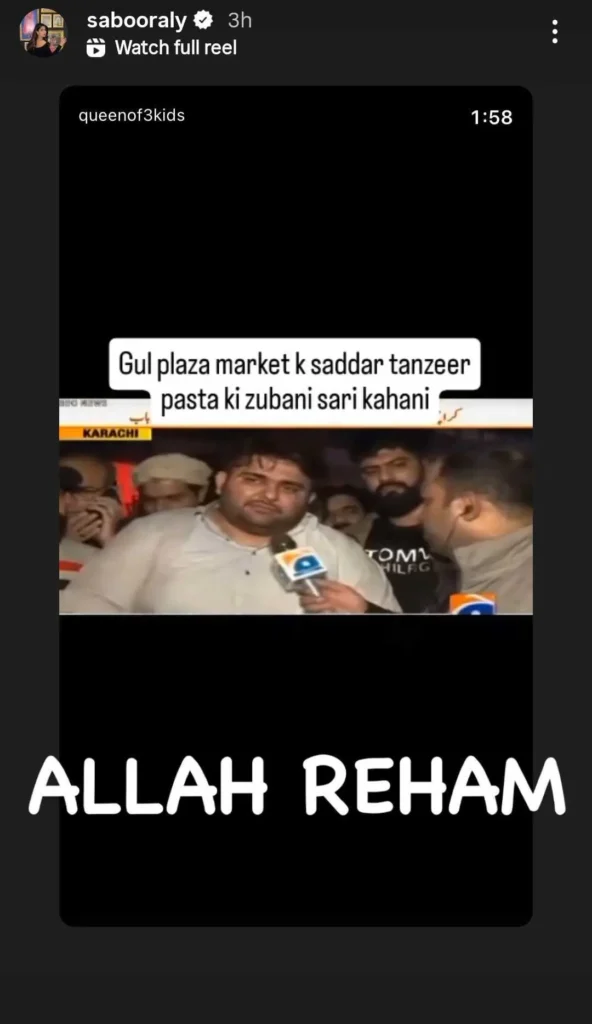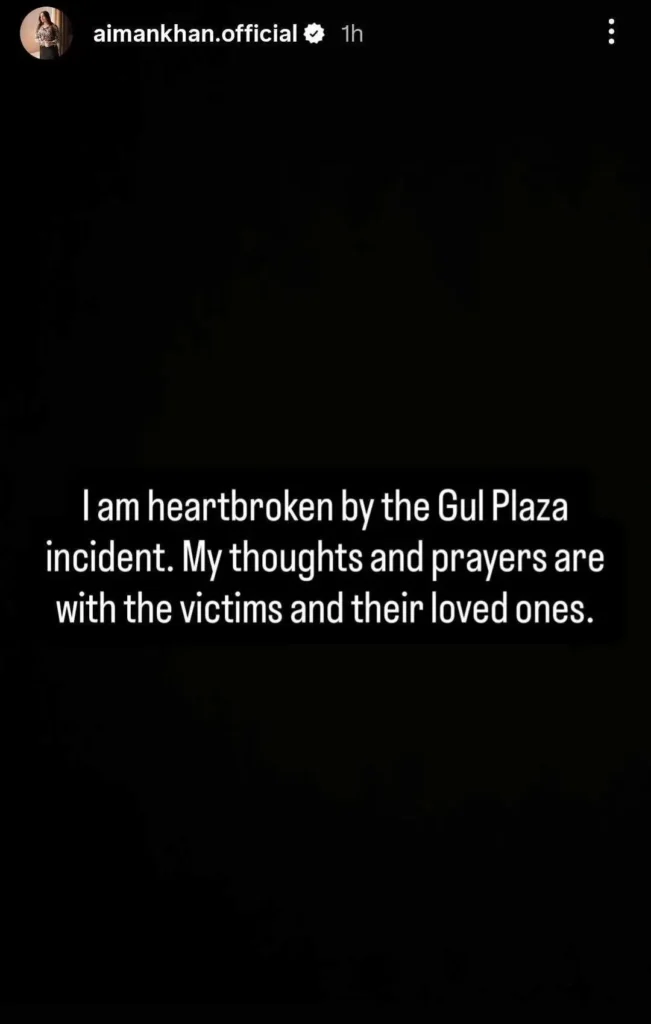 اداکارہ صبور علی نے گہرے رنج کا اظہار کرتے ہوئے اللہ سے رحم کی دعا کی، جبکہ یشمہ گل نے عمارت میں حفاظتی انتظامات کی کمی اور فائر سیفٹی کے فقدان پر تشویش ظاہر کی۔ فلم ساز عدنان ملک نے بتایا کہ وہ ایک ماہ قبل گل پلازہ گئے تھے اور اس وقت بھی عمارت کا ڈیزائن انہیں انتہائی گھٹن زدہ محسوس ہوا تھا۔