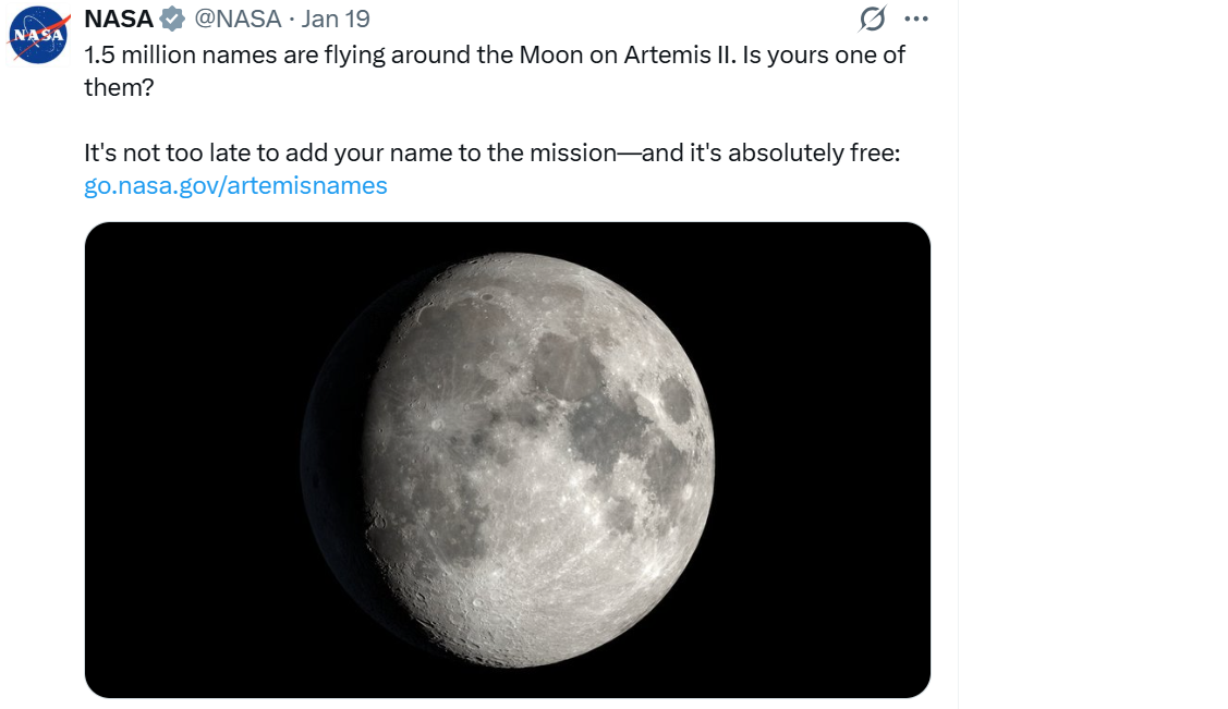 ناسا کی جانب سے سوشل میڈیا پلیٹ فارم ایکس پر جاری بیان میں عوام کو دعوت دی گئی ہے کہ وہ اس موقع سے فائدہ اٹھاتے ہوئے اپنا نام خلائی تاریخ میں درج کروائیں۔ ادارے کے مطابق یہ نام ایک ایس ڈی کارڈ میں محفوظ کیے جائیں گے، جسے آرٹیمس دوم مشن کے دوران خلائی جہاز اورین کے ساتھ روانہ کیا جائے گا، جو چاند کے گرد مدار میں گردش کرے گا۔