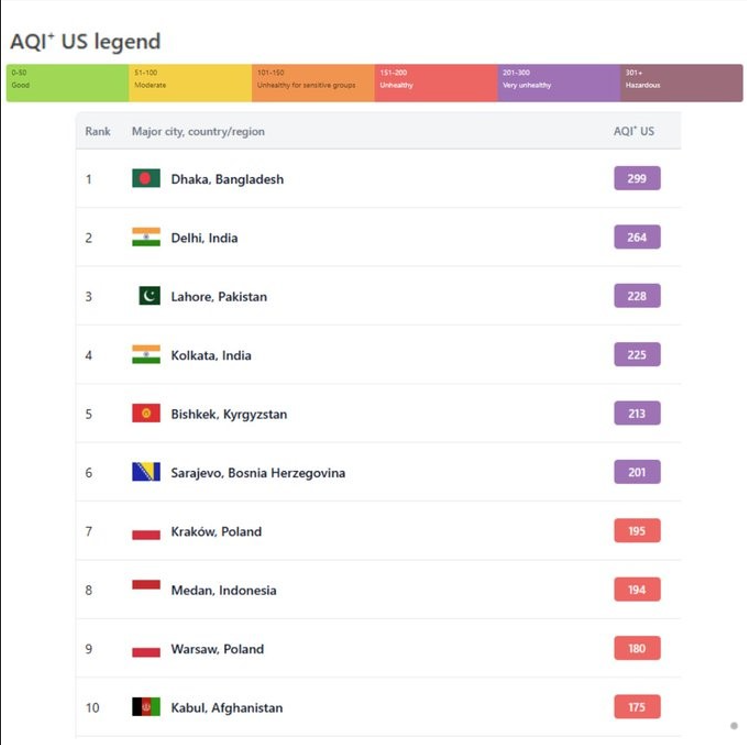 تازہ ترین رپورٹ کے مطابق، ڈھاکہ، بنگلہ دیش دنیا کے سب سے زیادہ آلودہ شہروں کی فہرست میں سرِ فہرست ہے، جہاں ایئر کوالٹی انڈیکس (AQI) 299 ریکارڈ کی گئی، جو خطرناک سطح Hazardous (انتہائی خطرناک) سے صرف ایک قدم نیچے یعنی “پرہول” زمرے میں آتی ہے۔