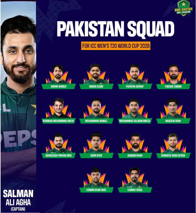 پاکستان نے ٹی ٹوئنٹی ورلڈ کپ 2026 کے لیے 15 رکنی اسکواڈ کا اعلان کر دیا۔