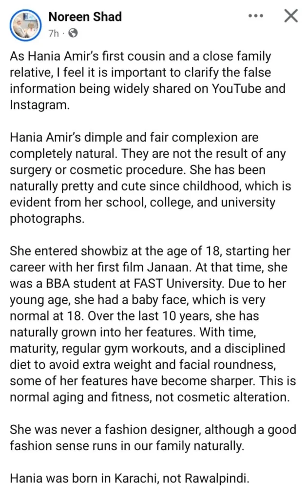 اس حوالے سے ہانیہ کی قریبی رشتہ دار اور کزن نورین شاد نے وضاحت پیش کرتے ہوئے کہا ہے کہ یہ تمام افواہیں بالکل بے بنیاد اور غلط ہیں، ہانیہ کے ڈمپل اور قدرتی رنگت ہمیشہ سے موجود ہیں اور یہ کسی بھی قسم کی کاسمیٹک سرجری کا نتیجہ نہیں ہیں۔
