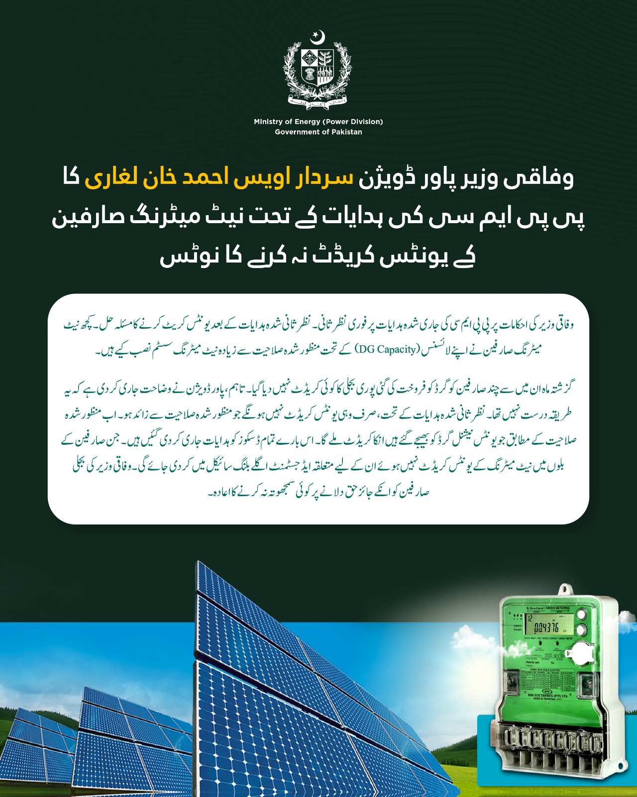 وفاقی وزیر برائے توانائی سردار اویس احمد خان لغاری نے نیٹ میٹرنگ صارفین کے بجلی کے یونٹس بلوں میں شامل نہ کیے جانے سے متعلق شکایات کا سختی سے نوٹس لے لیا ہے۔ پاور ڈویژن کے مطابق پاور پلاننگ اینڈ مانیٹرنگ کمپنی (پی پی ایم سی) کی جانب سے جاری کی گئی ہدایات کے بعد سامنے آنے والے مسائل کا فوری جائزہ لیا گیا اور متاثرہ صارفین کے یونٹس کریڈٹ نہ ہونے کا مسئلہ حل کر دیا گیا ہے۔