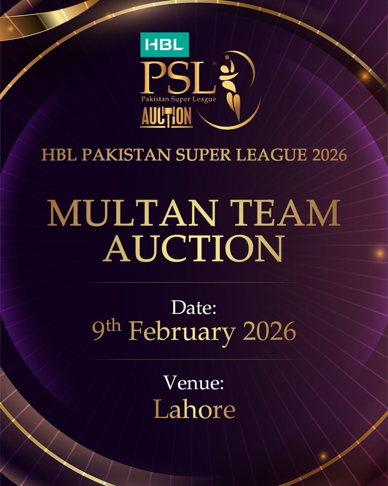 پی ایس ایل مینجمنٹ کی جانب سے اعلان کیا گیا ہے کہ فرنچائز ملتان سلطانز کی نیلامی 9 فروری کو لاہور میں ہوگی۔
