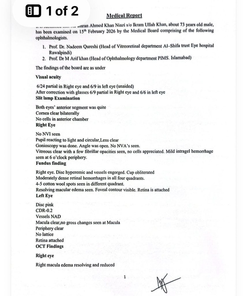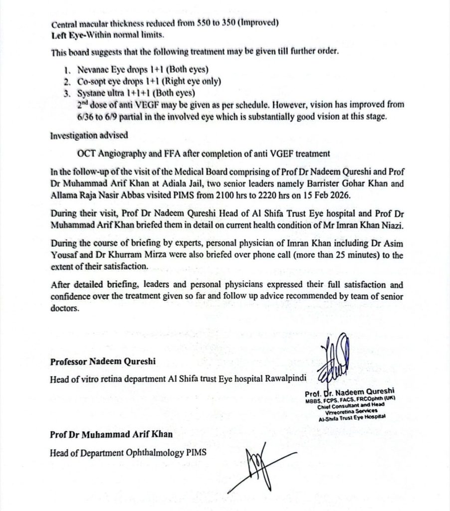 میڈیکل بورڈ نے 15 فروری 2026 کو بانی پی ٹی آئی کا معائنہ کیا۔ بورڈ میں الشّفاء ٹرسٹ آئی اسپتال کے پروفیسر ڈاکٹر ندیم قریشی اور پمز اسلام آباد کے پروفیسر ڈاکٹر محمد عارف خان شامل تھے۔