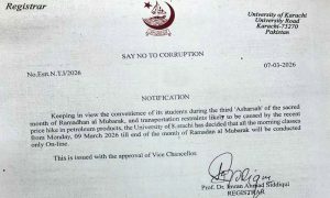 اعلامیے کے مطابق 9 مارچ سے رمضان المبارک کے اختتام تک جامعہ کراچی کی تمام مارننگ کلاسزآن لائن منعقد کی جائیں گی۔