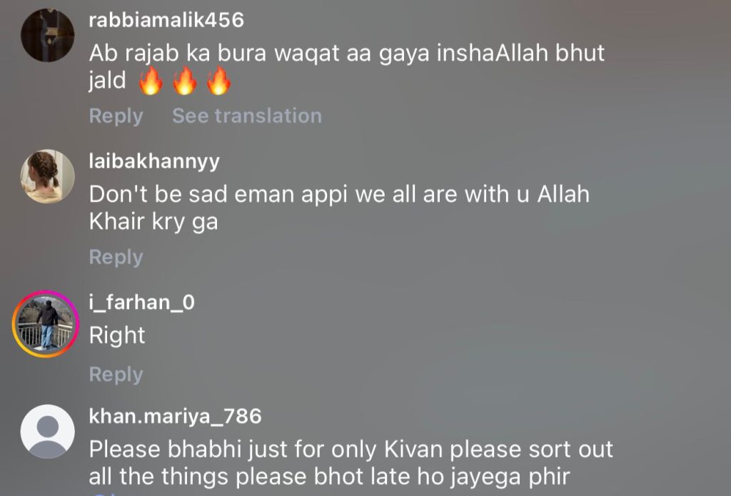 ایک اور صارف نے کہا فکر مت کریں ایمان بھابھی، ہم سب آپ کے ساتھ ہیں، اللہ خیر کرے گا۔کچھ صارفین نے مزید تبصرہ کیا کہ اب رجب کے لیے مشکل وقت آ گیا ہے، اور اللہ تعالیٰ بہت جلد حالات بہتر کرے گا۔