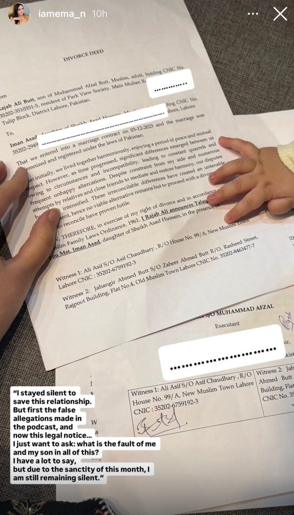 پاکستانی یوٹیوبر اور فیملی وی لاگر رجب بٹ نے اپنی اہلیہ ایمان رجب کی انسٹاگرام اسٹوری پر کھل کر تنقید کی، جس میں ان کے بیٹے کیوان کے ہاتھ کو طلاق کے کاغذات پر دکھایا گیا تھا۔