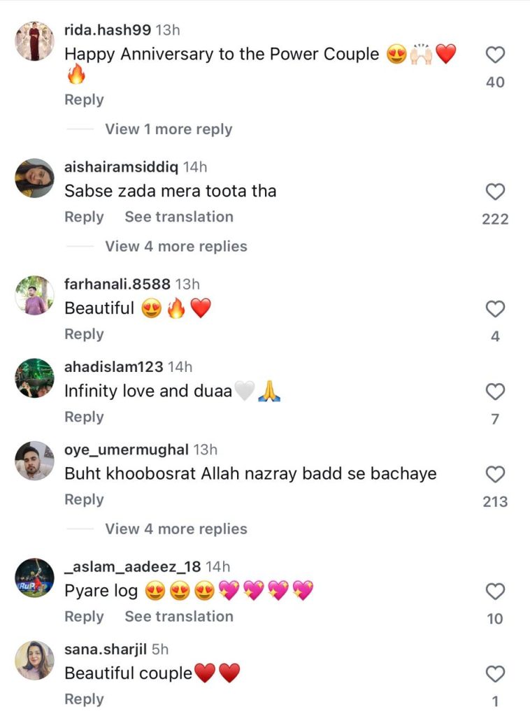 ان کی اس پوسٹ کو مداحوں کی جانب سے بھرپور پذیرائی حاصل ہوئی، جہاں سوشل میڈیا صارفین اور شوبز شخصیات نے جوڑے کو مبارکباد پیش کرتے ہوئے ان کے مضبوط اور خوشگوار رشتے کو سراہا۔ مختلف صارفین نے نیک خواہشات کا اظہار کرتے ہوئے ان کی ازدواجی زندگی کے لیے دعائیں بھی کیں۔