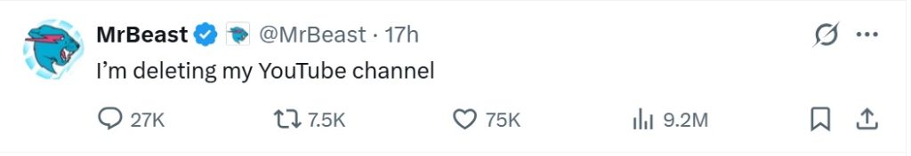 عالمی شہرت یافتہ یوٹیوبر مسٹر بیسٹ نے اپنے یوٹیوب چینل کو ڈیلیٹ کرنے کا اعلان کر کے مداحوں کو حیرت میں مبتلا کر دیا۔
