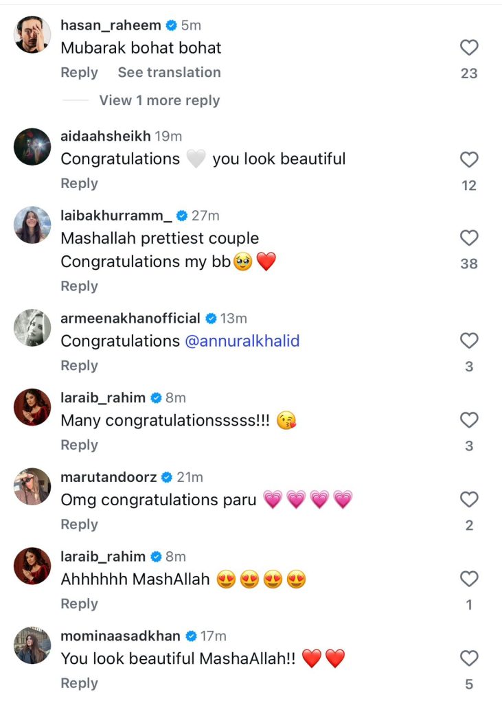 انورال خالد نے اپنے انسٹاگرام اکاؤنٹ پر شادی کی تصاویر بھی شیئر کیں، جن میں وہ دلہن کے روپ میں نہایت سادہ، پُروقار اور دلکش انداز میں نظر آئیں۔