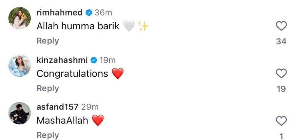 سوشل میڈیا ان تصاویر کے سامنے آنے کے بعد گلوکار حسن رحیم، اداکارہ کنزا ہاشمی سمیت دیگر شوبز شخصیات نے بھی انہیں شادی پر مبارکباد پیش کی۔ جبکہ مداحوں کی جانب سے مبارکباد، نیک تمناؤں اور نئی زندگی کے لیے دعاؤں کا سلسلہ جاری ہے۔