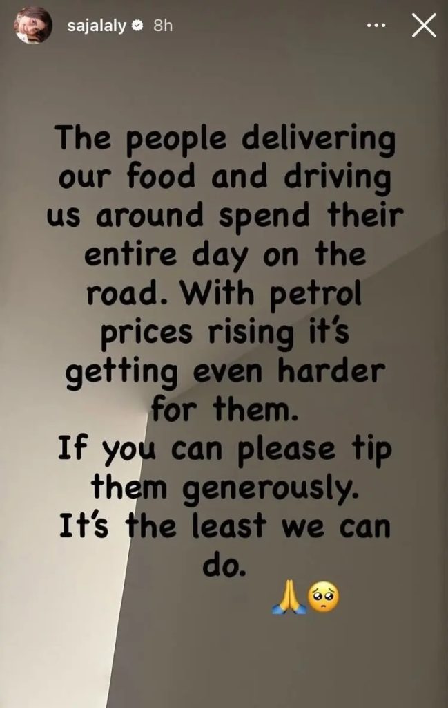سجل علی نے اپنے انسٹاگرام اسٹوری پر جذباتی انداز میں لکھا کہ جو لوگ ہمیں کھانا ڈیلیور کرتے ہیں اور ہمیں ایک جگہ سے دوسری جگہ لے کر جاتے ہیں، وہ اپنا پورا دن سڑک پر گزارتے ہیں۔ پیٹرول کی قیمتوں میں اضافے کے ساتھ ان کے لیے حالات مزید مشکل ہوتے جا رہے ہیں۔