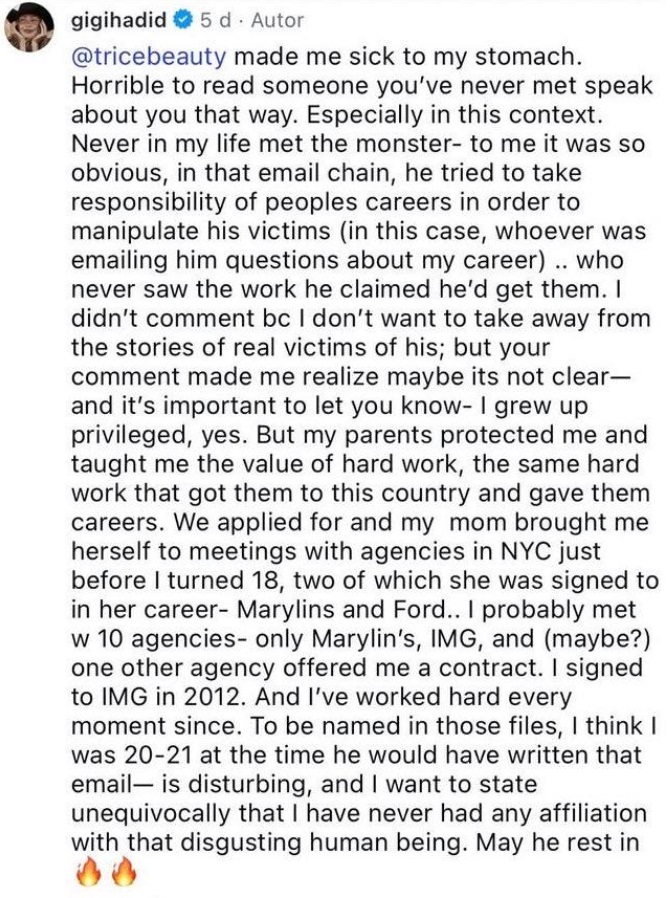 اپنی انسٹاگرام پوسٹ کے تبصرے میں جیجی حدید نے جیفری ایپسٹین کو انتہائی گھٹیا انسان قرار دیتے ہوئے کہا کہ یہ صورتحال پریشان کن ہے، کہ کوئی شخص جس سے کبھی کوئی تعلق یا وابستگی نہیں رہی، وہ آپ کے بارے میں بات کیوں کریں گا۔