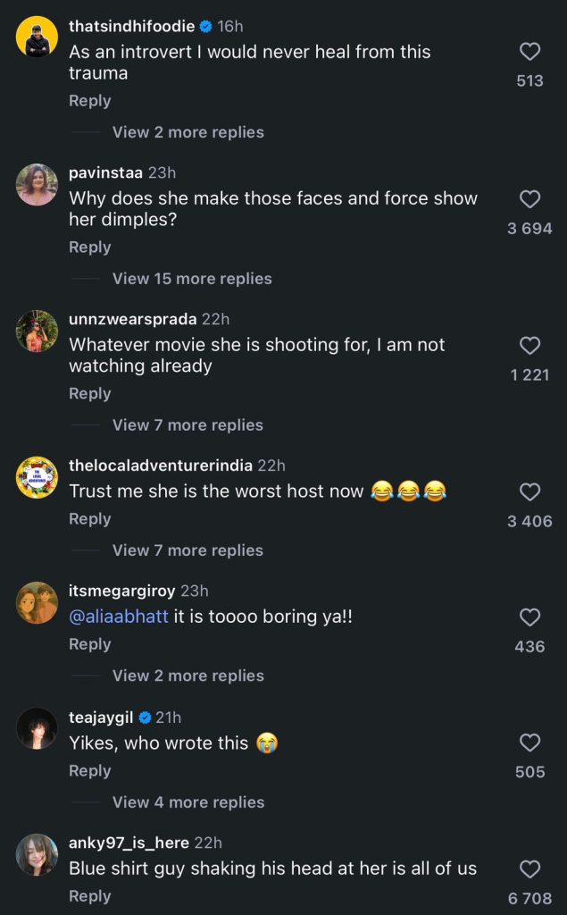 صارفین کا کہنا تھا کہ عالیہ بھٹ اسٹیج پر گھبرائی ہوئی نظر آئیں، ان کی کامیڈی ٹائمنگ مؤثر نہیں تھی اور مجموعی انداز ناظرین کے لیے متاثر کن ثابت نہیں ہوا۔ بعض تبصروں میں اسے “غیر آرام دہ” تجربہ بھی قرار دیا گیا۔