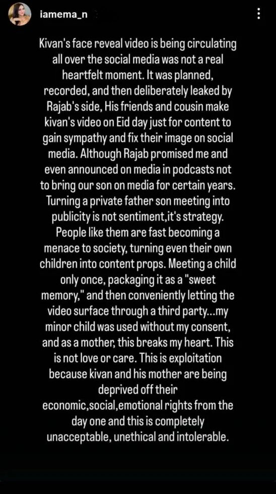 ایمان فاطمہ نے اپنی انسٹاگرام اسٹوری پر بتایا کہ ان کے بیٹے کیوان سلطان سے منسوب وائرل “فیس ریویل” ویڈیو کو ایک جذباتی لمحے کے طور پر پیش کیا جا رہا ہے، جبکہ حقیقت اس کے برعکس ہے۔