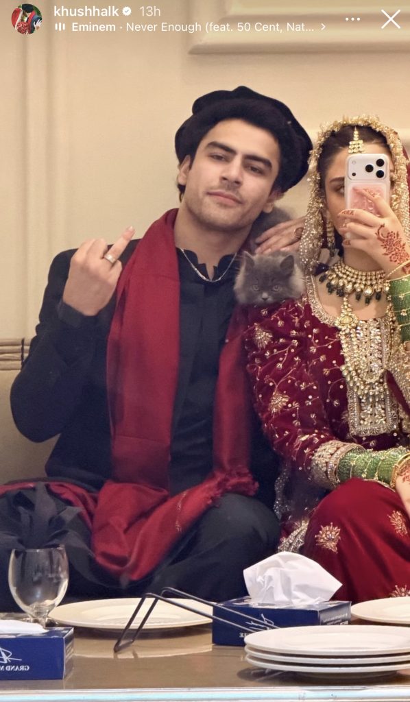 مزید برآں، دونوں نے اپنے انسٹاگرام اکاؤنٹس پر اسٹوریز بھی شیئر کیں، جن میں رمشا خان اور خوشحال خان کو عروسی لباس میں دیکھا جا سکتا ہے، جبکہ اداکارہ آئینے کے سامنے سیلفی لیتی نظر آئیں۔ ایک اور جھلک میں یہ جوڑا اپنی پالتو بلی کے ساتھ خوشگوار لمحات گزارتا دکھائی دیا۔