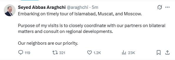 سماجی رابطے کی ویب سائٹ ایکس پر پوسٹ کرتے ہوئے انہوں نے کہا کہ وہ مسقط اورروس کادورہ بھی کرینگے،ہمارے پڑوسی ہماری اولین ترجیح ہیں،علاقائی صورتحال اوردوطرفہ امورپرمشاورت کیلئےدورہ کروں گا۔