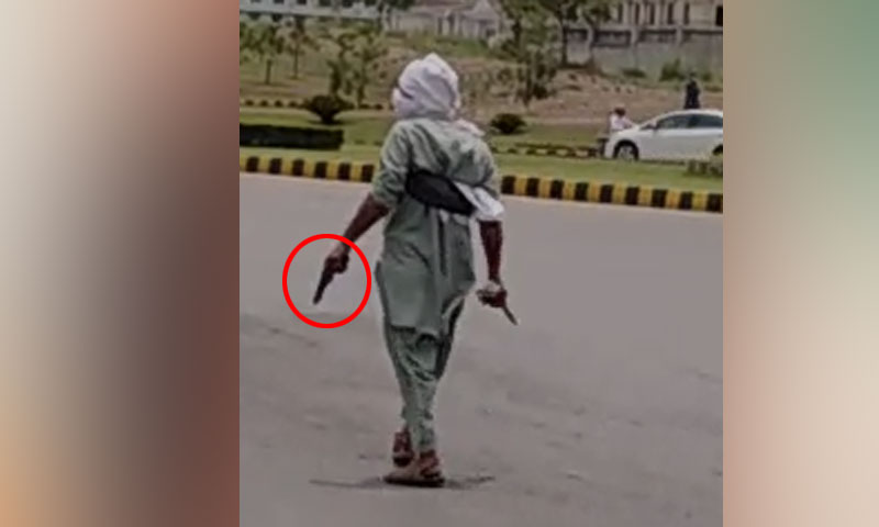 شلوار قمیض میں ملبوس ایک شخص ہاتھ میں پستول اٹھائے سڑک پر گھومتا رہا